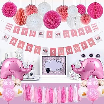 Baby Shower Decorations For Girl Elephant Theme It S A Girl Party Decor With Paper Pom Poms Girl Shower Banners Honeycomb Balls Baby Elephant